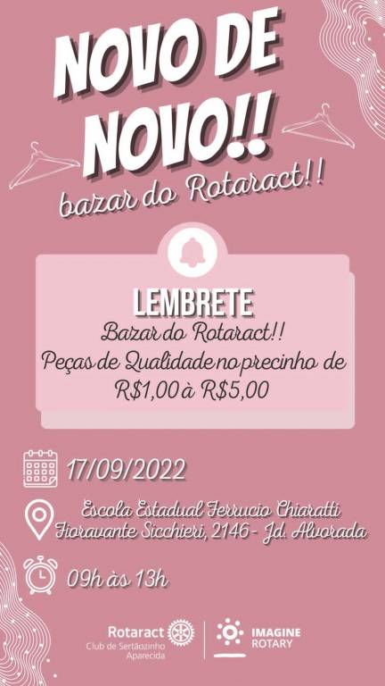 Vem aí a primeira edição do projeto Novo de Novo- Bazar do Rotaract, venderemos roupas seminovas em ótima qualidade, por preços acessíveis sendo de R$1,00 à R$5,00 no intuito de ajudar a população em situação mais vulnerável a conseguirem se vestir com qualidade.